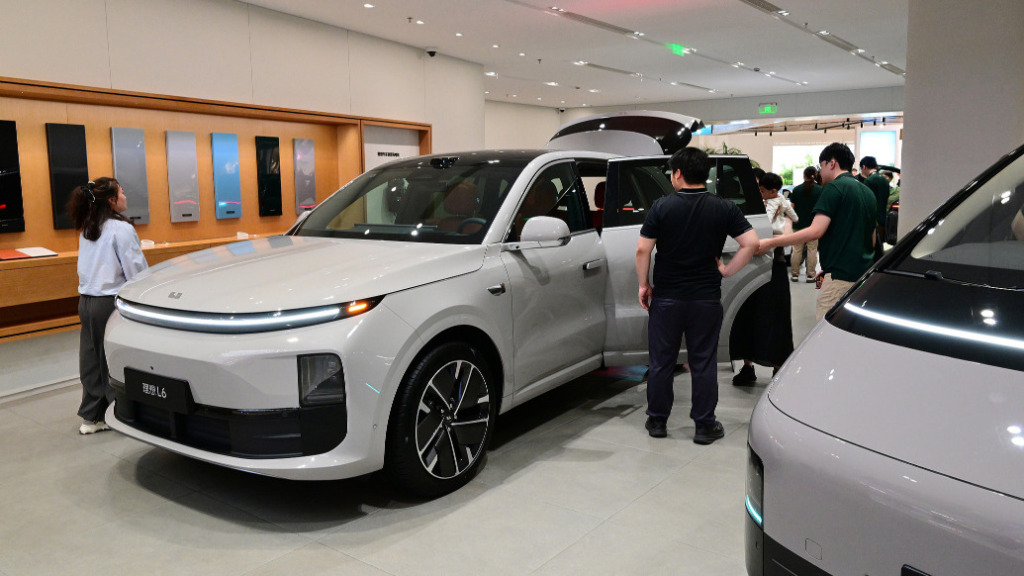 一家新能源汽车展卖店内,消费者在看车买车。视觉中国 图