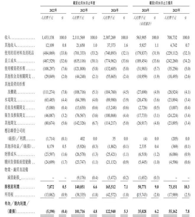 根据招股书,在2022年、2023年及2024年以及截至2024年及2025年3月31日止三个月,巴奴火锅分别实现收入14.331亿元、21.116亿元、23.073亿元、5.639亿元及7.087亿元。上述时期内的利润分别为,-520万元、1.017亿元、1.229亿元、3500万元及、5520万元的利润。同期,经调整净利润(非国际财务报告准则指标)分别为4150万元、1.437亿元、1.959亿元、5750万元及7670万元。同期经调整净利润率分别为2.9%、6.8%、8.5%以及10.8%。